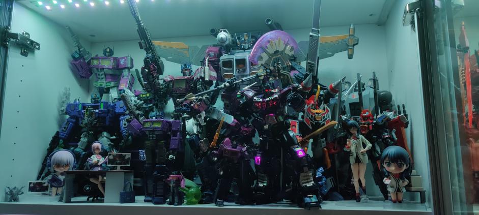 The aforementioned “purple Optimus waifu shelf” is indeed real and it is indeed the top shelf on that cabinet.